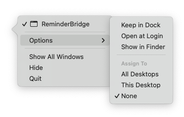 - Hide Dock Icon - Optionally hide the Dock icon and keep ReminderBridge in the menu bar only (especially helpful if you like to keep your desktop clean and keep the window closed)